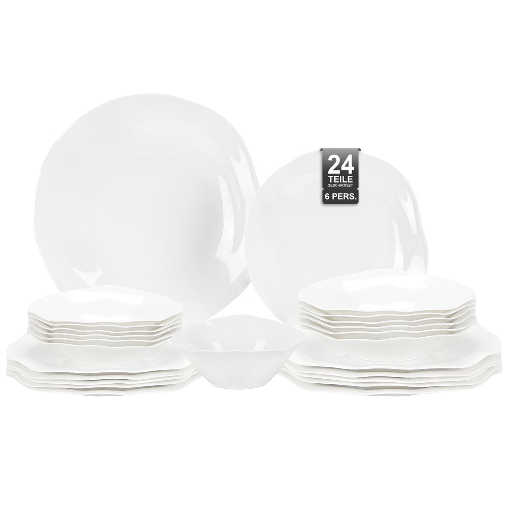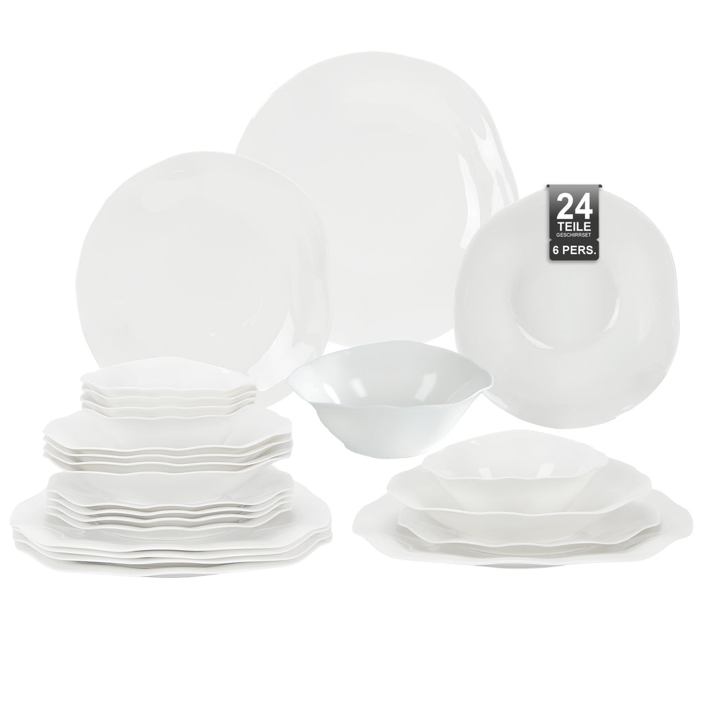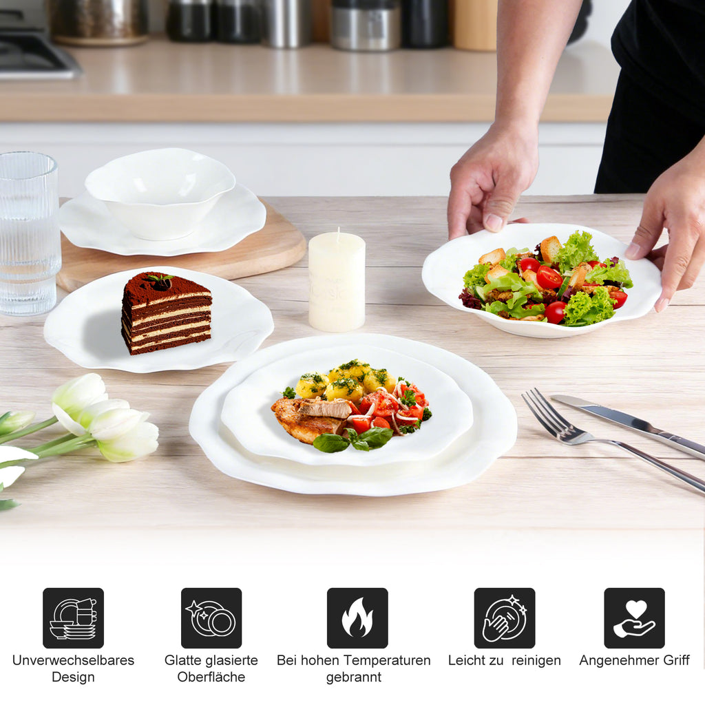 Das 24-teilige Tafelgeschirr-Set verbindet zeitlose Eleganz mit moderner Optik und wertet jede Tafel stilvoll auf. Die reinweiße Farbgebung und die sanft geschwungenen, wellenförmigen Ränder, die an Blütenblätter erinnern, verleihen diesem Set eine harmonische und lebendige Erscheinung. Es eignet sich sowohl für den täglichen Gebrauch als auch für festliche Anlässe. Die hochwertige Verarbeitung und das durchdachte Design machen dieses Set zu einer langlebigen Investition für den Haushalt oder zu einem idealen Geschenk für besondere Gelegenheiten.