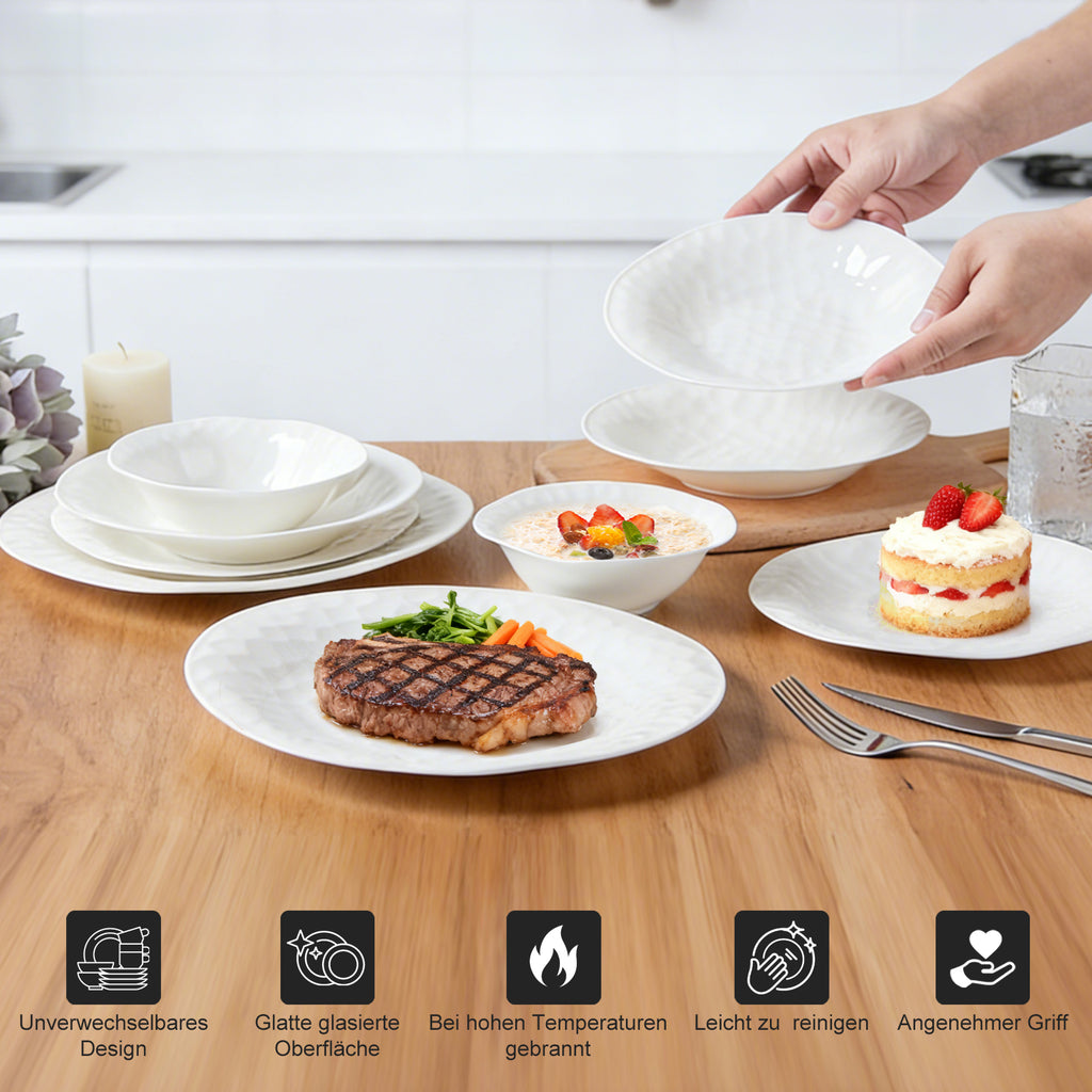 Verleihen Sie Ihrem Esstisch zeitlose Eleganz und moderne Raffinesse mit diesem 24-teiligen Tafelservice für 6 Personen. Das hochwertige Geschirr überzeugt durch seine besondere Ästhetik und hervorragende Funktionalität, ideal für den täglichen Gebrauch ebenso wie für festliche Anlässe. Das reinweiße Design mit strukturierter Oberfläche fügt sich harmonisch in jede Kücheneinrichtung ein.