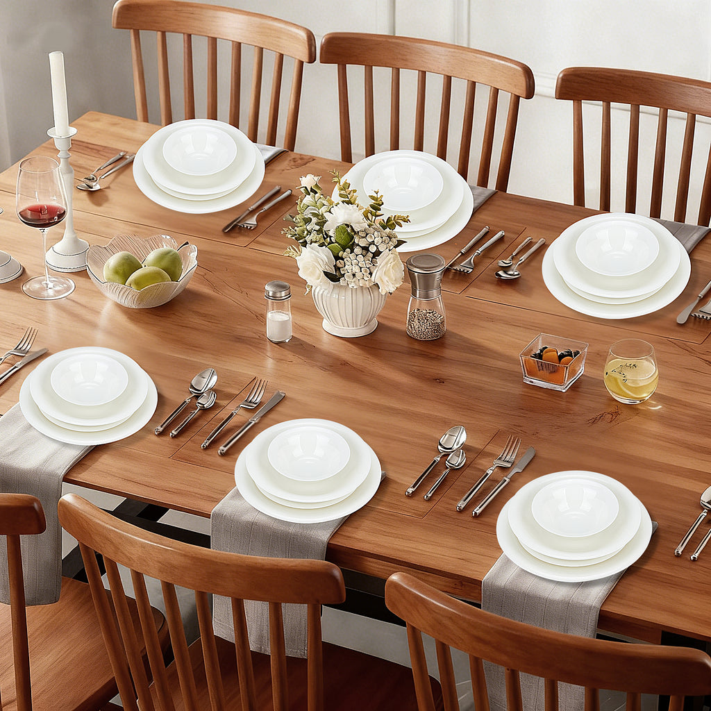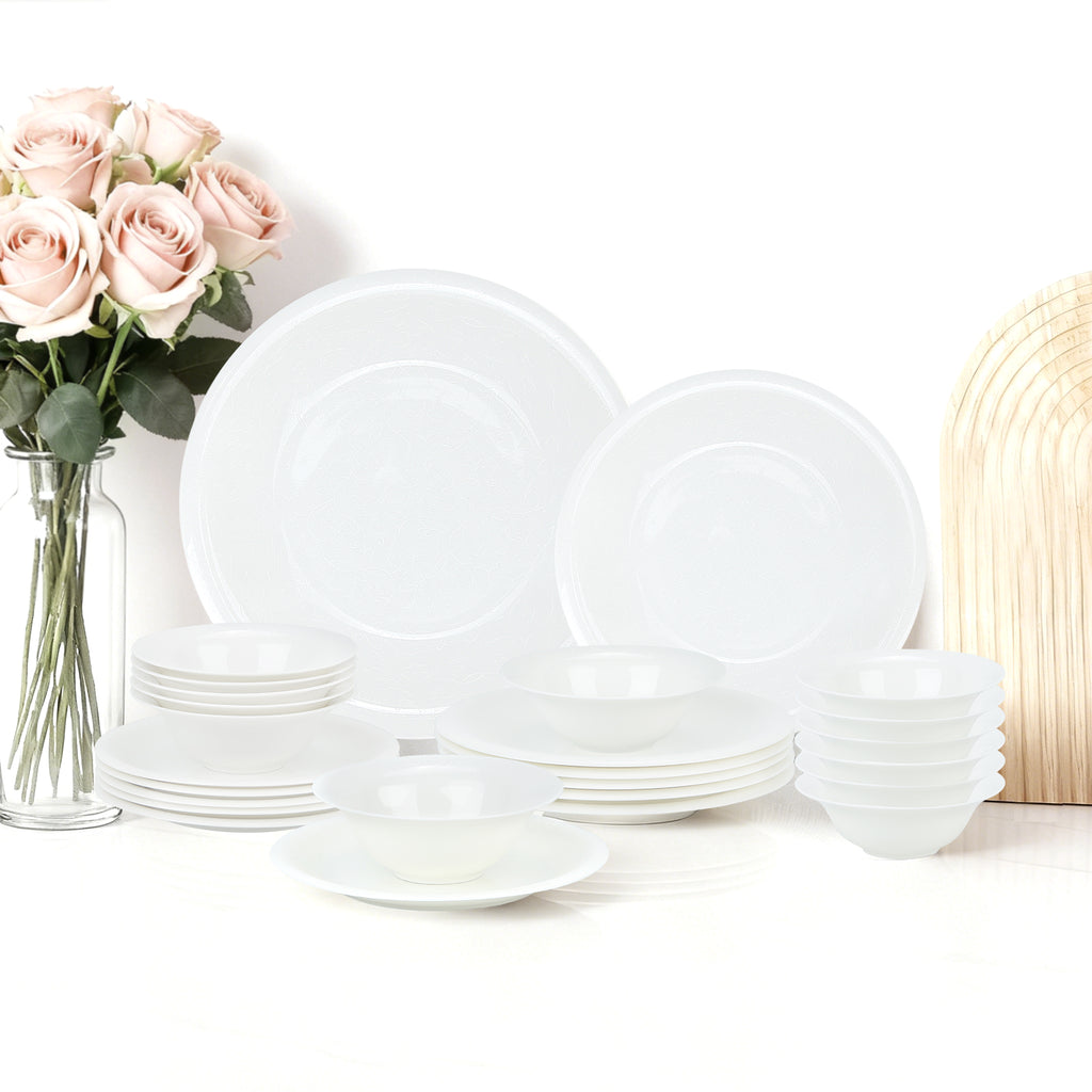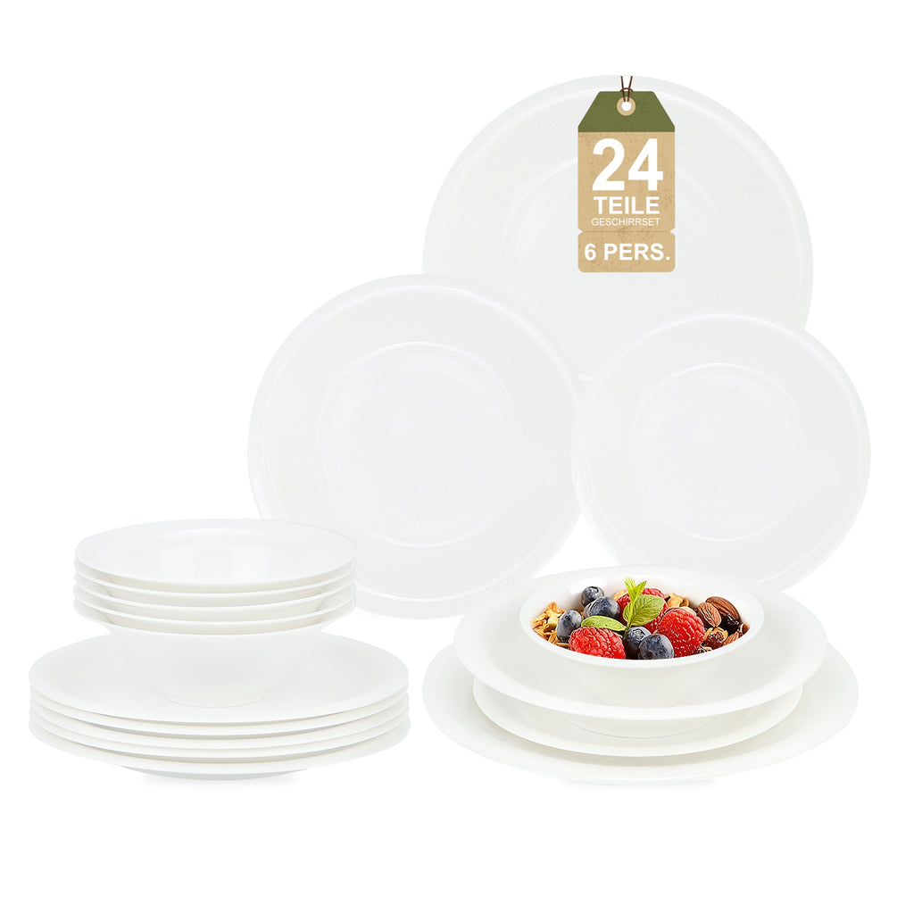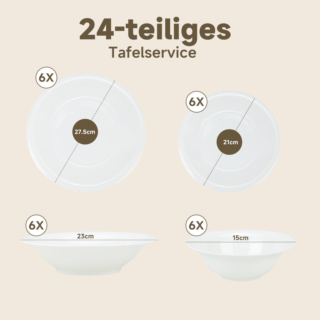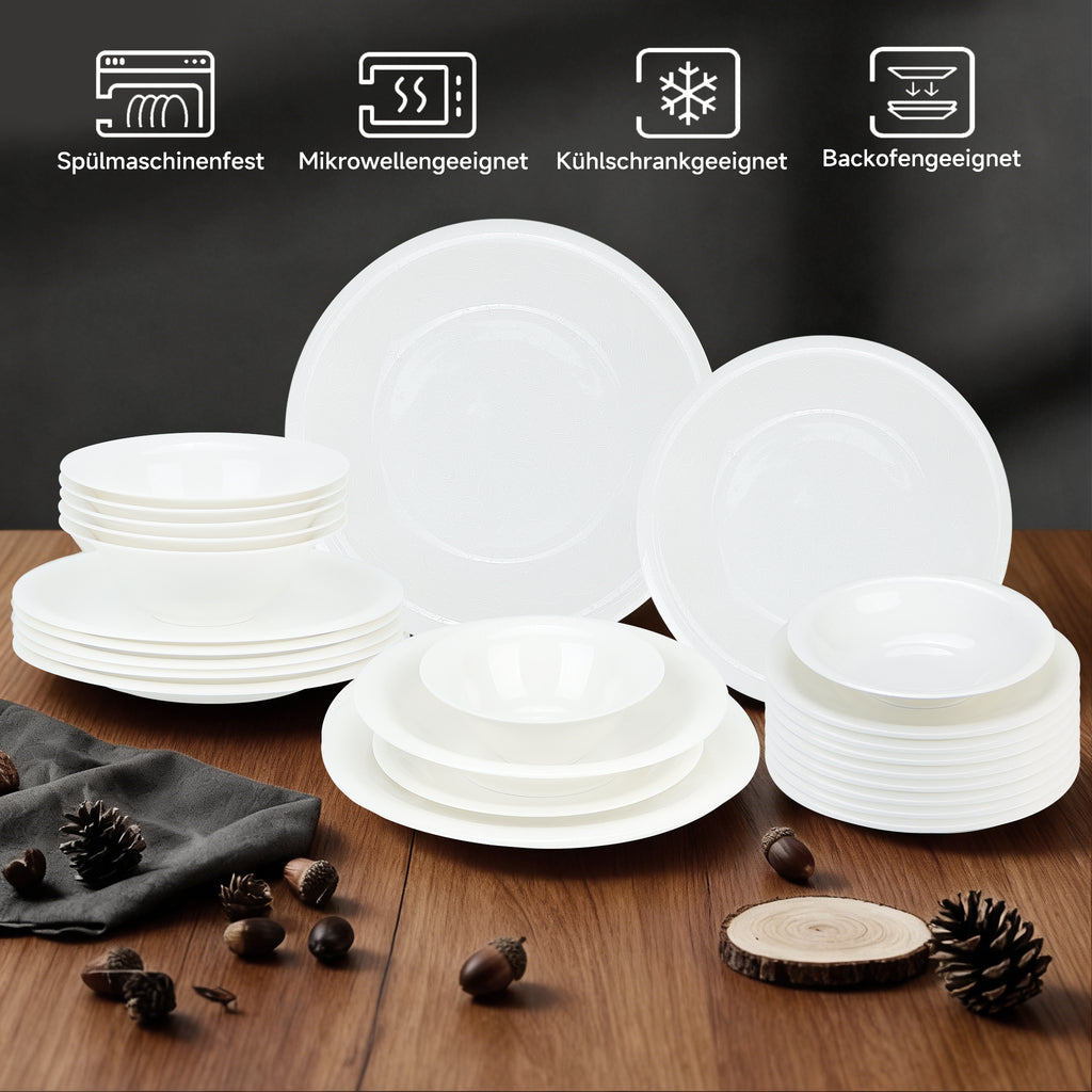 Dieses 24 teilige Kombiservice ist die perfekte Wahl für alle, die an ihrem Esstisch Wert auf stilvolle Details und praktische Handhabung legen. Das Set besticht durch ein dezentes, eingearbeitetes Reliefmuster, das dem klassischen Weiß eine moderne und zugleich romantische Struktur verleiht. Es ist ideal für den täglichen Gebrauch in der Familie sowie für festliche Anlässe geeignet und bietet eine vollständige Gedecklösung für bis zu sechs Personen. Durch die zeitlose Optik lässt sich das Geschirr hervorragend mit verschiedensten Tischdekorationen und Farbkonzepten kombinieren.