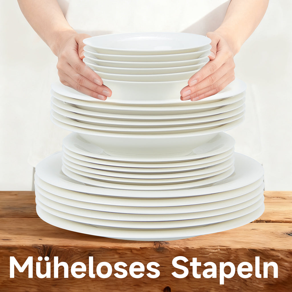 Ein besonderes Merkmal dieses Services ist das filigrane Strukturdesign, das sich über den Rand der Teller zieht und für eine einzigartige Haptik sowie eine edle Optik sorgt. Gefertigt aus erstklassiger Keramik, wurde das Material bei extrem hohen Temperaturen gebrannt, was es besonders widerstandsfähig und langlebig macht. Das Geschirr ist für den modernen Alltag konzipiert es ist nicht nur spülmaschinenfest und mikrowellengeeignet, sondern hält auch den Temperaturen im Backofen sowie im Kühlschrank stand. Die glatte, porenfreie Glasur verhindert das Anhaften von Speiseresten und erleichtert die Reinigung erheblich. Zudem sind die Teller und Schalen so geformt, dass sie sich platzsparend und stabil im Küchenschrank stapeln lassen.