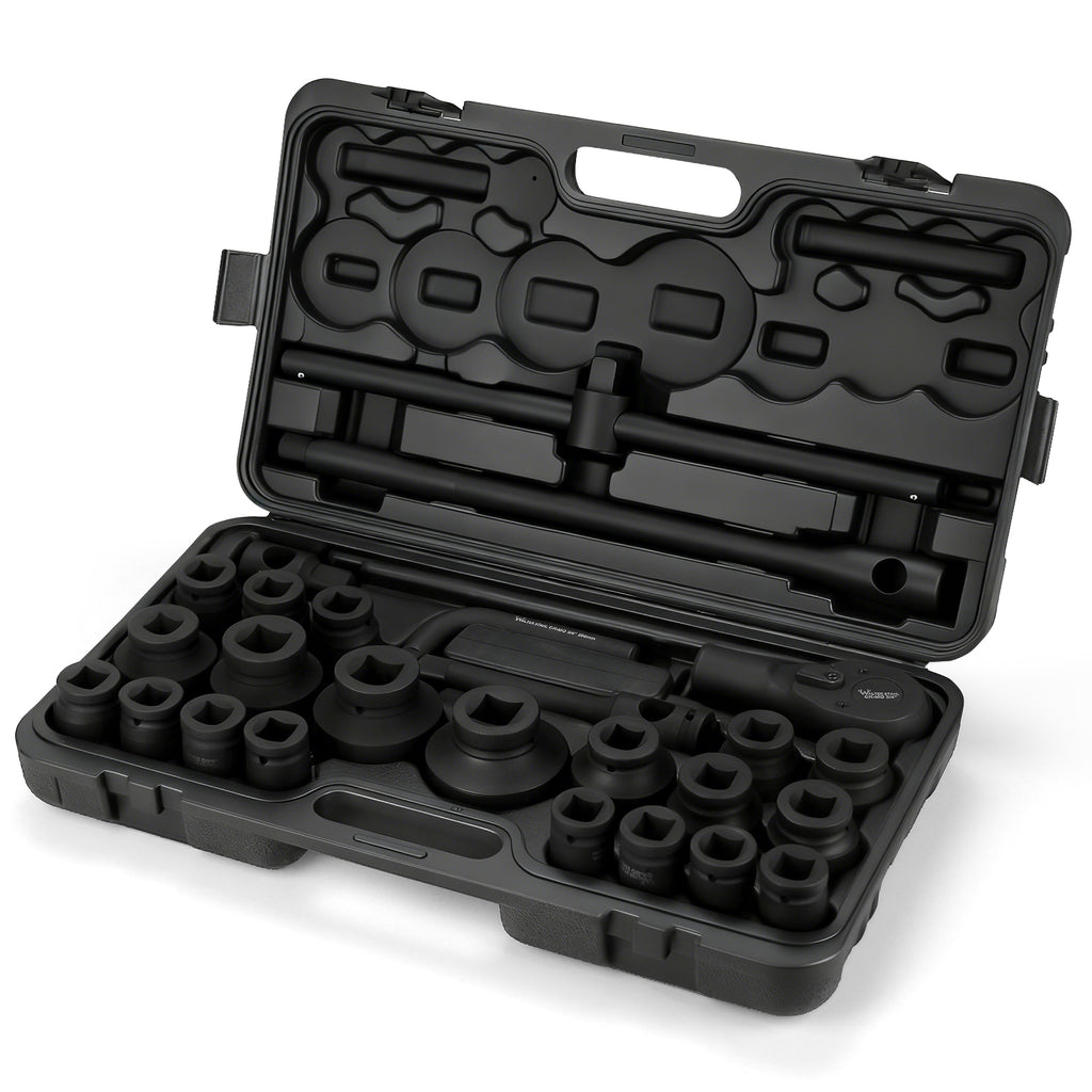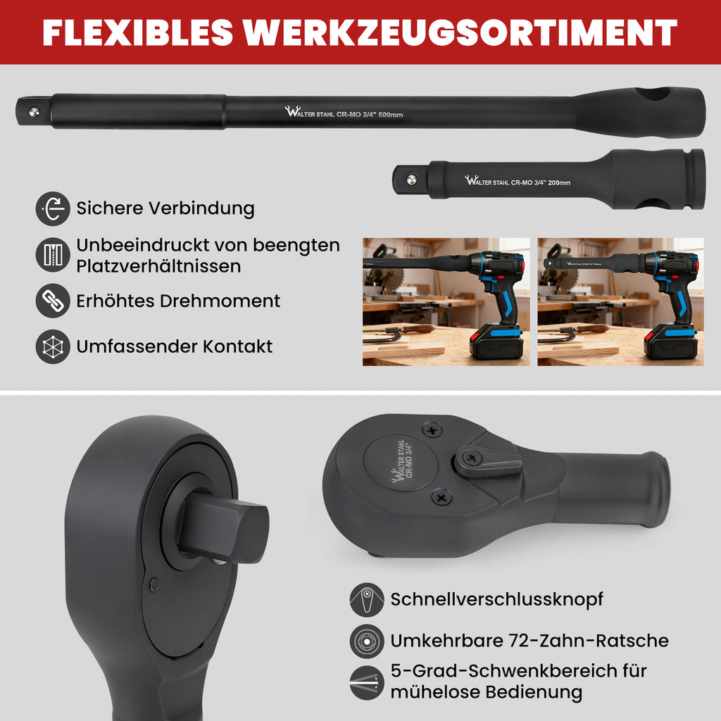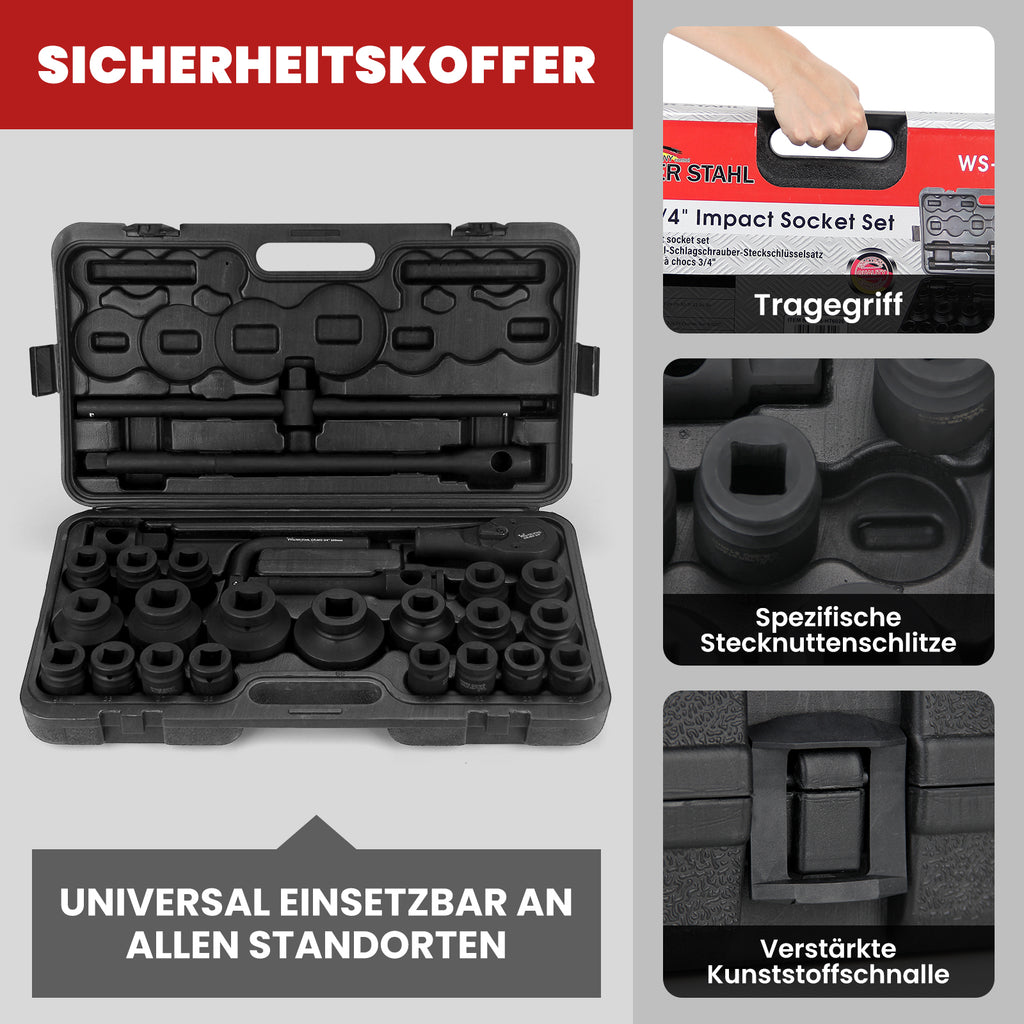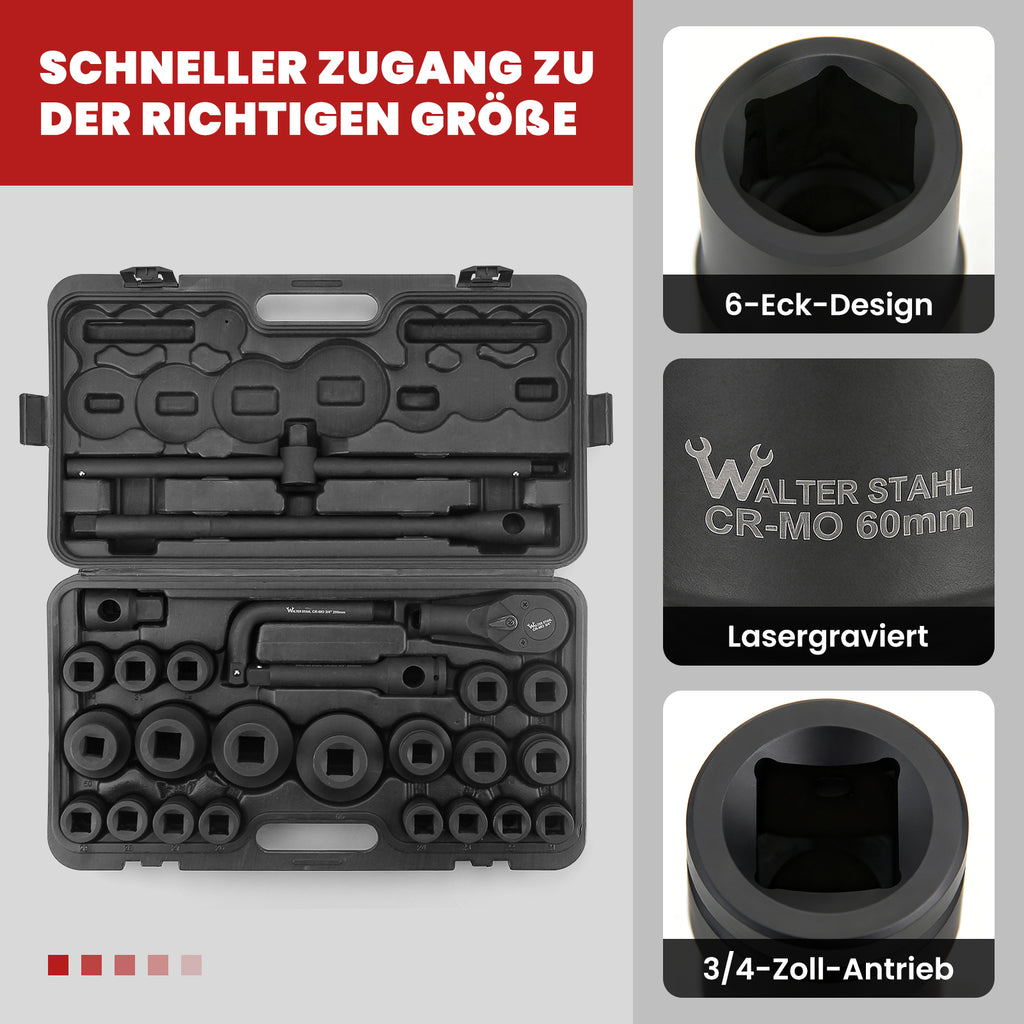 Der 26-teilige Schlagschrauber-Steckschlüsselsatz mit 3/4 Zoll Antrieb von Walter Stahl ist die richtige Wahl für professionelle Anwender im Schwerlastbereich. Das Set wurde für intensive Arbeiten an LKW, Traktoren, Landmaschinen sowie US-Fahrzeugen entwickelt und ist speziell auf zöllige Schraubengrößen (SAE) ausgelegt. Dank robuster Konstruktion und durchdachtem Zubehör eignet sich dieses Kraftnuss-Set ideal für Werkstatt, Industrie und mobile Einsätze.