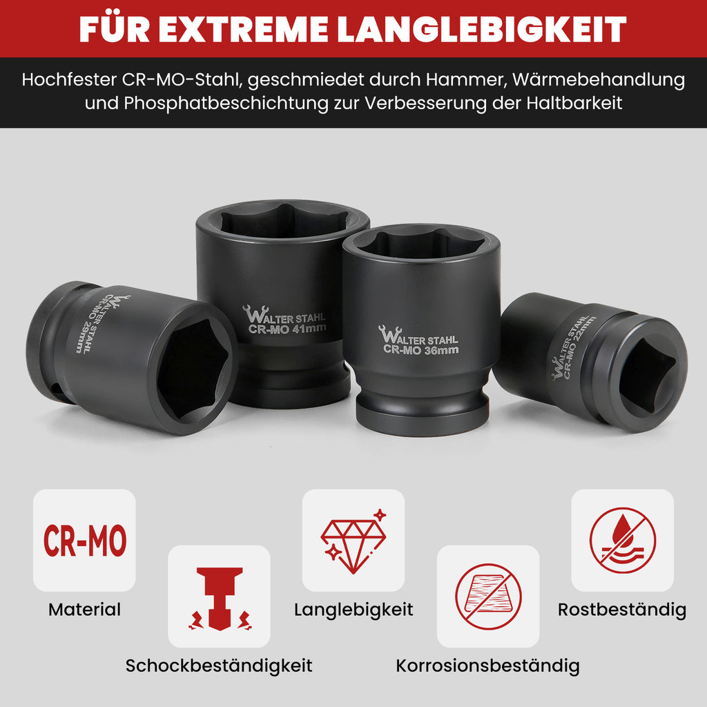 Gefertigt aus Chrom-Molybdän-Stahl, der für hohe Drehmomente und die dauerhafte Nutzung mit Schlagschraubern konzipiert ist. Deutlich belastbarer als herkömmlicher Cr-V Stahl.