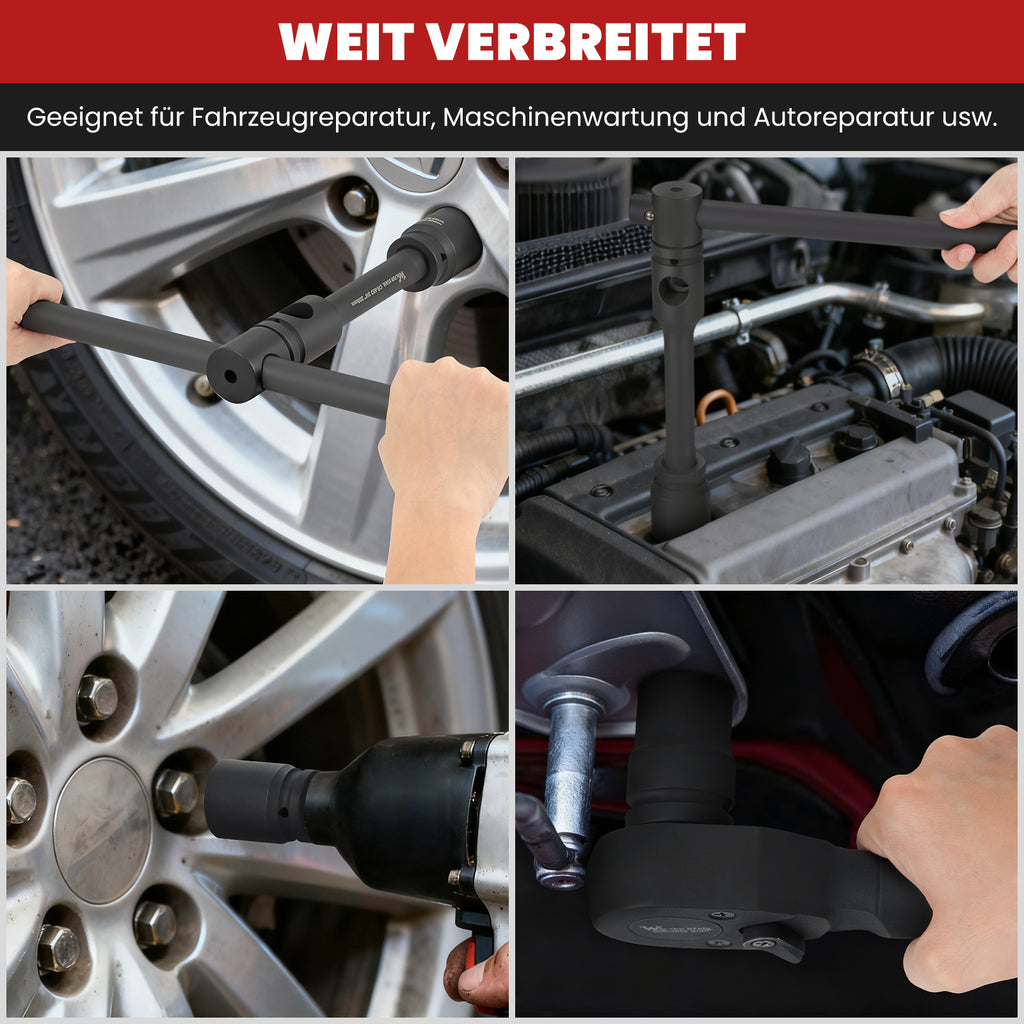 Neben den Kraftnüssen enthält das Set eine stabile Umschaltknarre, eine gleitende T-Stange, einen L-Griff, zwei extra lange Verlängerungen sowie einen Adapter für maximale Flexibilität.