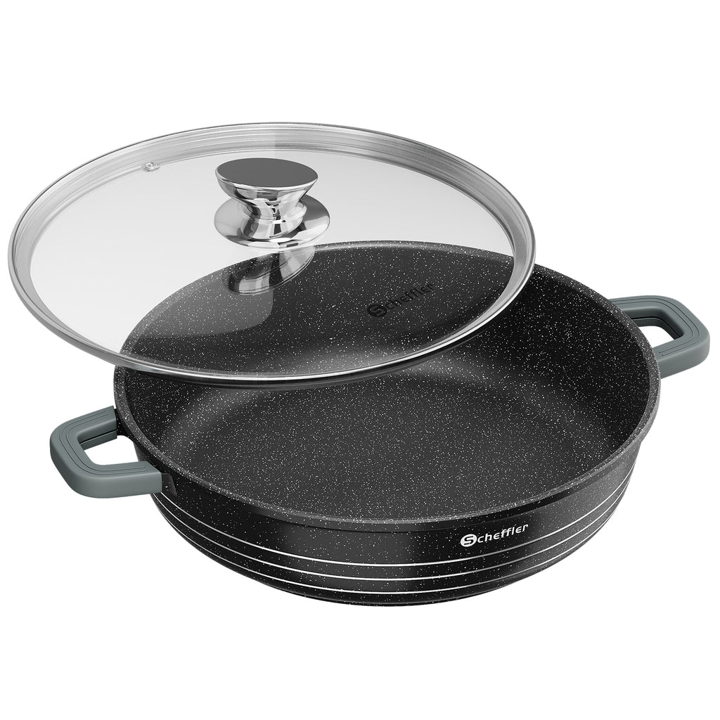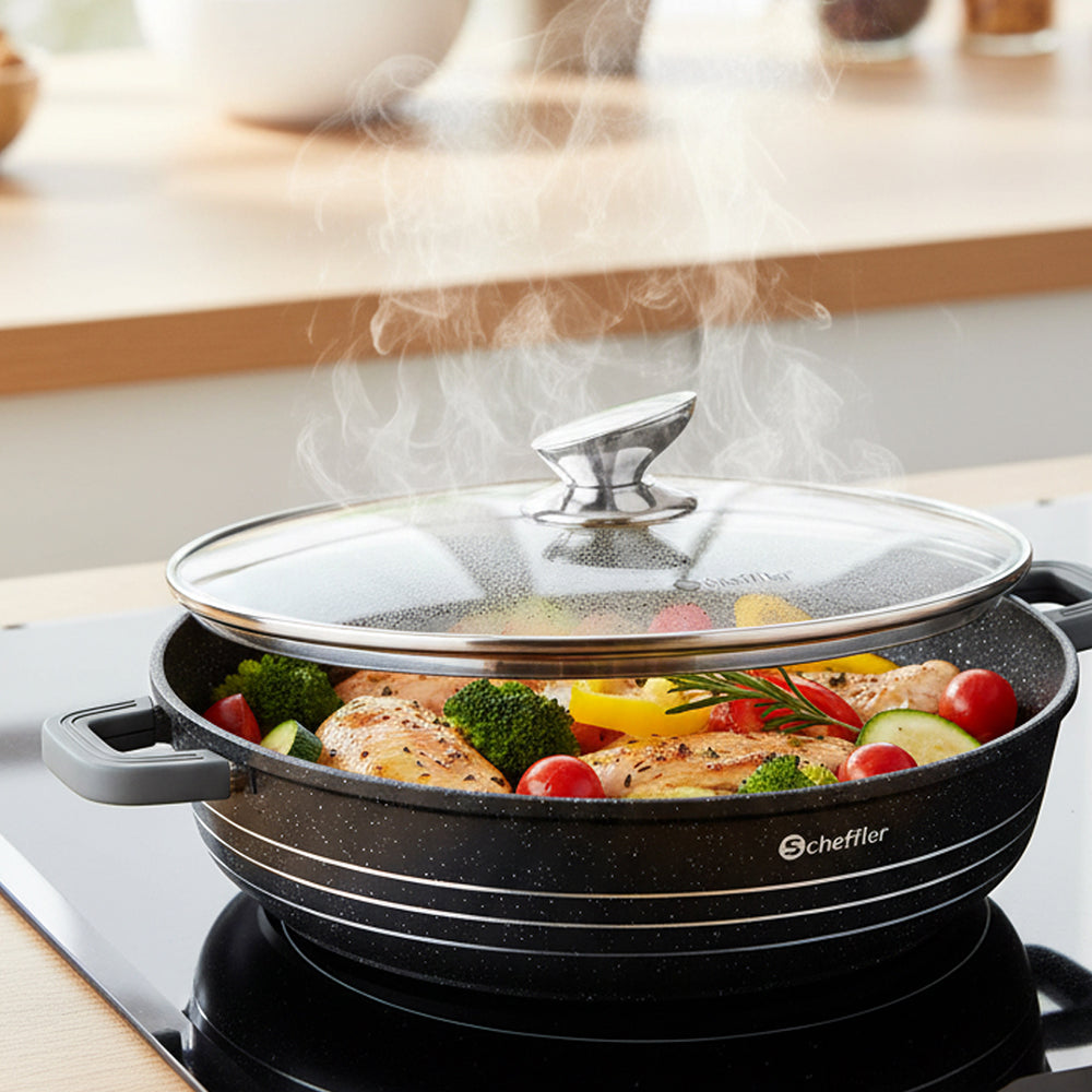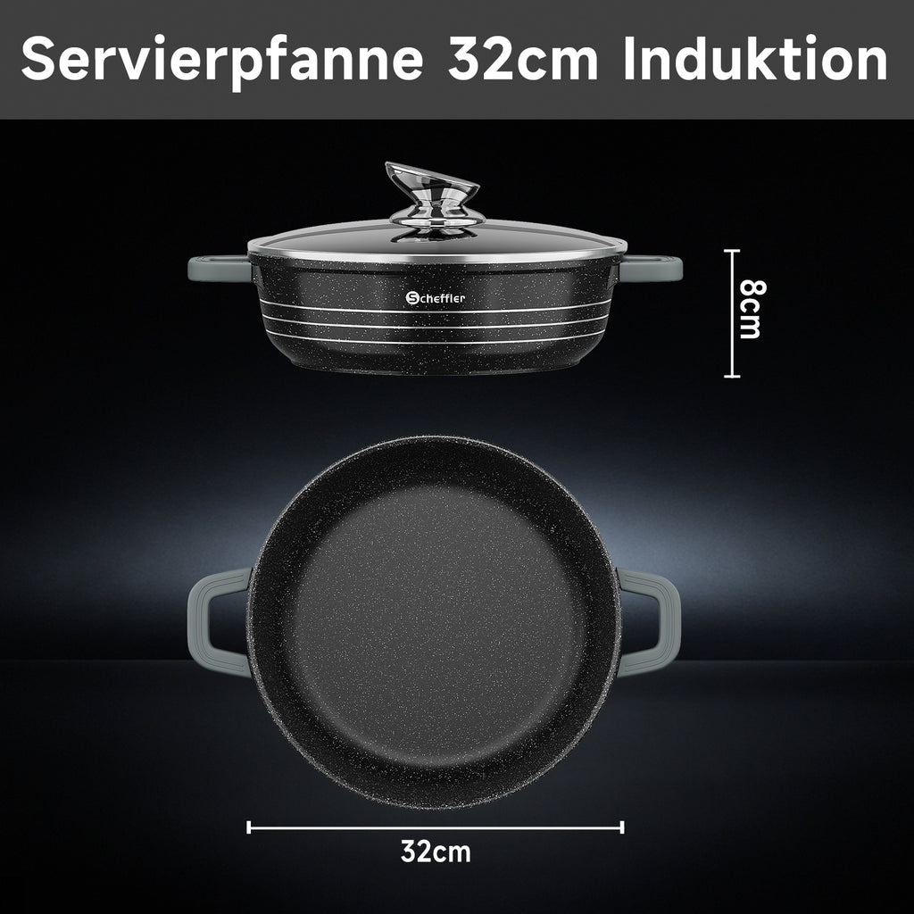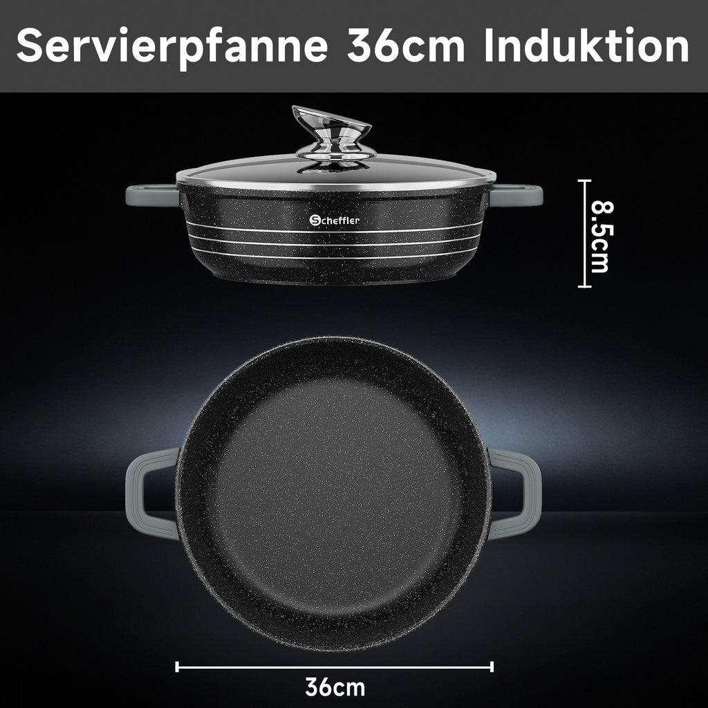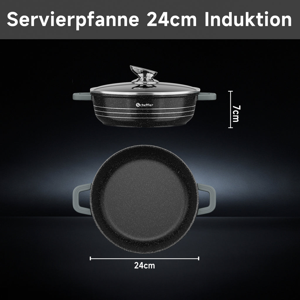 Scheffler Induktions-Servierpfanne aus Aluminiumguss mit marmorierter Antihaftbeschichtung, Glasdeckel und hitzebeständigem Silikongriff