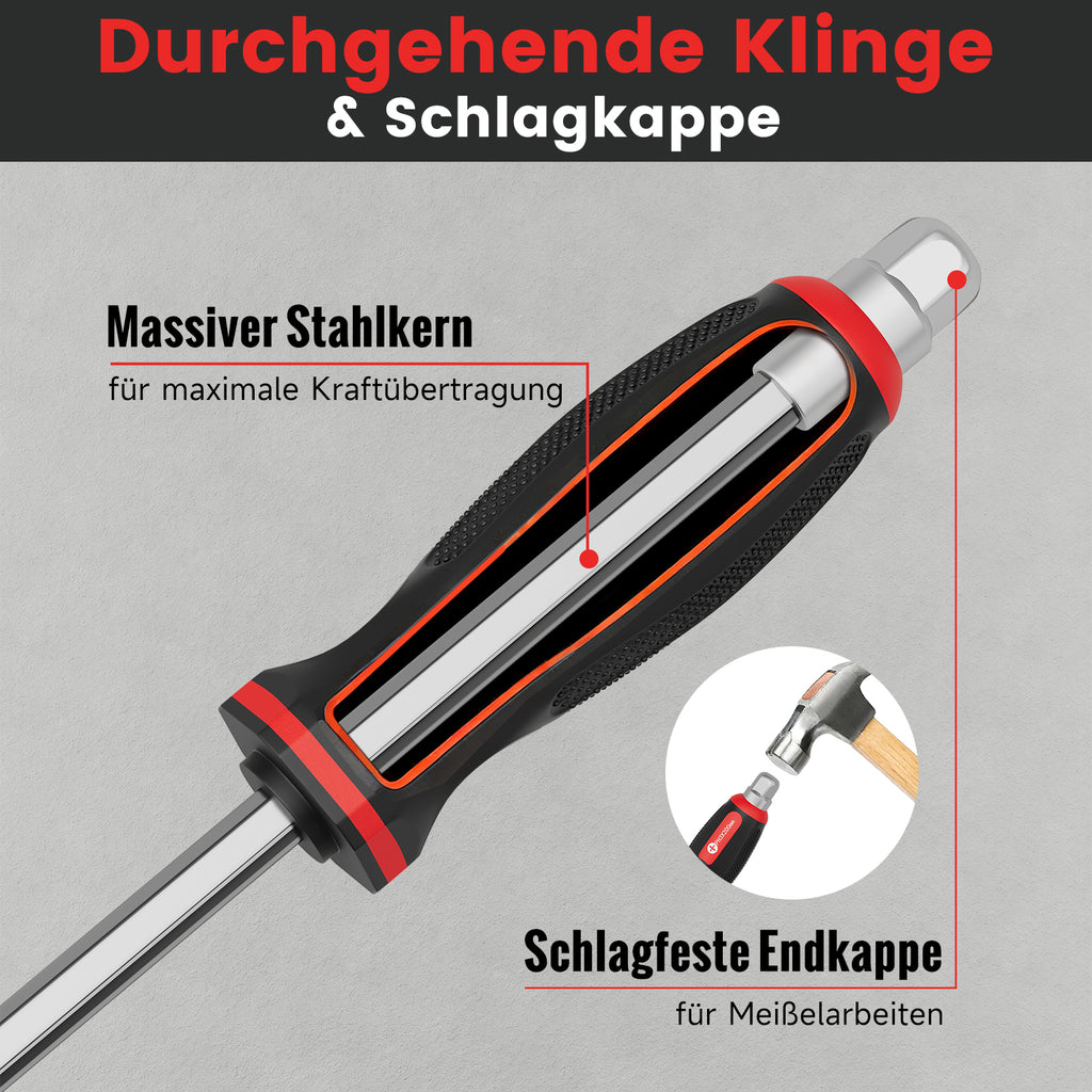 Jeder Schraubendreher besitzt eine durchgehende Klinge aus massivem Stahl, die bis in eine widerstandsfähige Metall-Schlagkappe am Griffende reicht. Dadurch können gezielte Hammerschläge ausgeführt werden, um festsitzende Schrauben zu lösen oder leichte Meißelarbeiten zu erledigen.