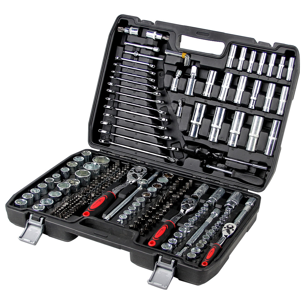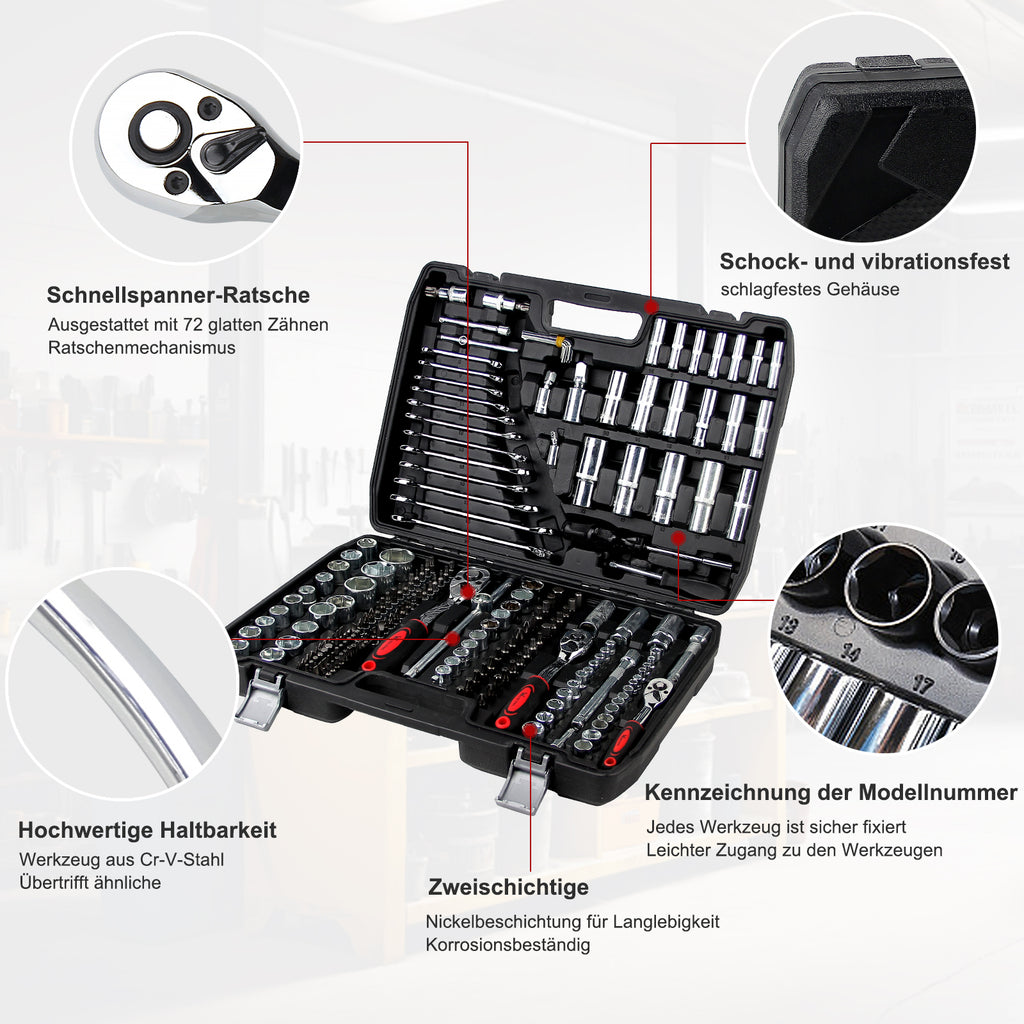 Alle Werkzeuge bestehen aus widerstandsfähigem Chrom-Vanadium-Stahl. Sie sind ordentlich in einem stabilen Kunststoffkoffer verstaut, wobei jedes Teil seinen festen Platz mit Beschriftung hat und beim Transport gesichert bleibt.