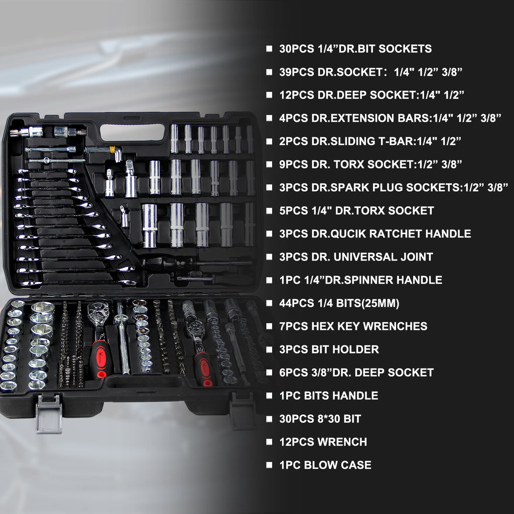 Mit drei Antriebsgrößen (1/4 Zoll, 3/8 Zoll und 1/2 Zoll) deckt das Set den gesamten Arbeitsbereich ab. Neben klassischen Stecknüssen enthält es spezialisierte Aufsätze wie E-Profil-Nüsse (Außentorx) und Zündkerzeneinsätze.