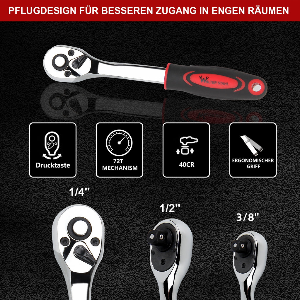 3 x Umschaltknarren mit Schnelllöser (1/4, 3/8, 1/2 Zoll)