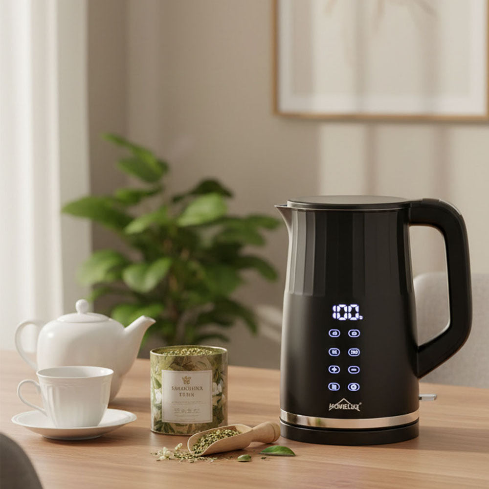 Stilvolles Design: Der Homelux Wasserkocher beeindruckt mit einer eleganten, glänzenden Klavierlack-Oberfläche in Schwarz und einem dezent integrierten Touch-Bedienelement. Das zeitgemäße, durchgehend schwarze Design passt perfekt in moderne Küchen und verleiht ihnen eine luxuriöse Note.