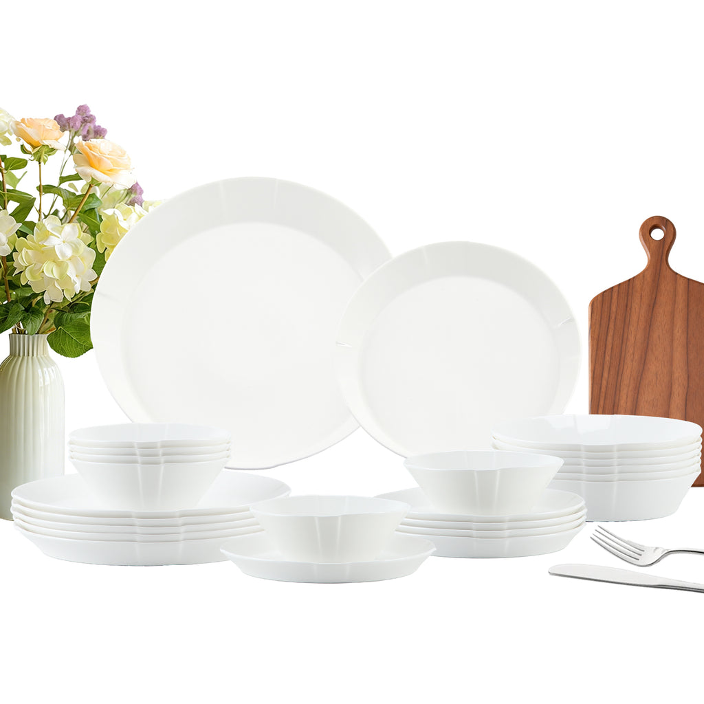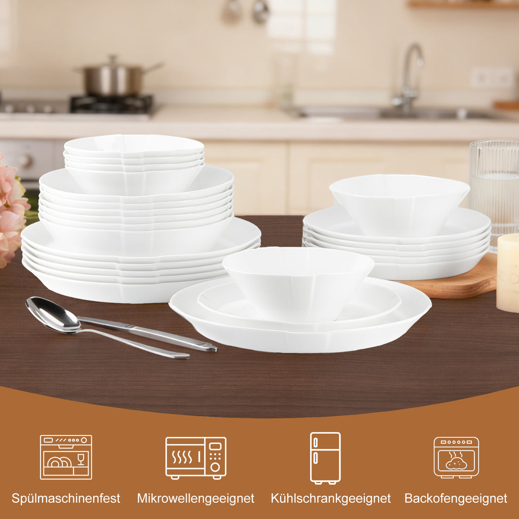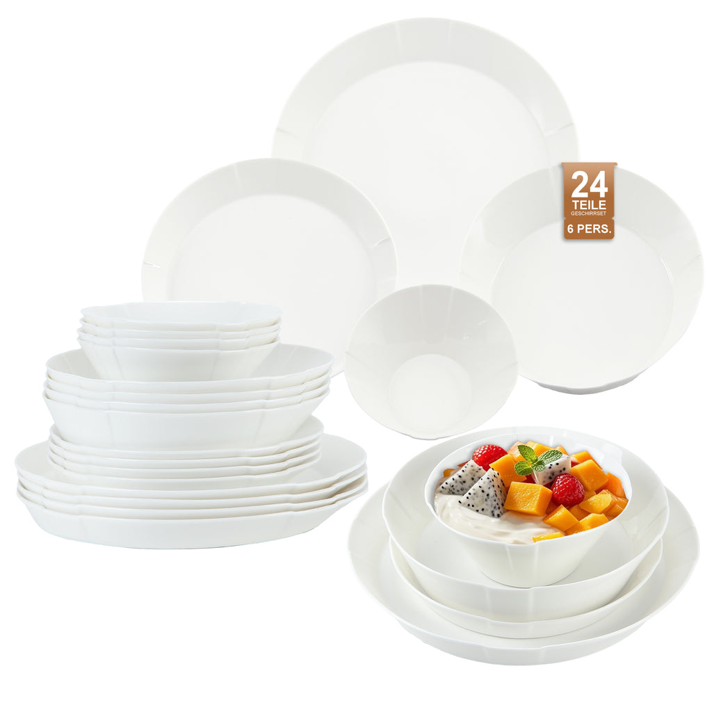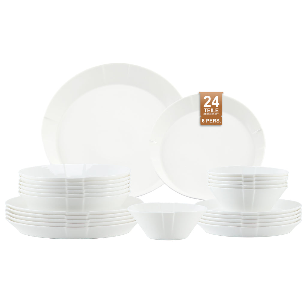 Verschönern Sie Ihre Mahlzeiten im Alltag und bei besonderen Anlässen mit diesem eleganten 24-teiligen Geschirrset aus reinweißem Porzellan. Das minimalistische Design wird durch ein dezentes Facetten-Relief am Rand veredelt und verleiht jedem gedeckten Tisch eine moderne und zugleich zeitlose Optik. Das Set verbindet ästhetische Feinheit mit robuster Qualität und ist ideal für anspruchsvolle Haushalte.