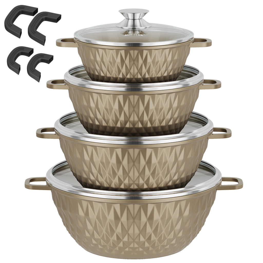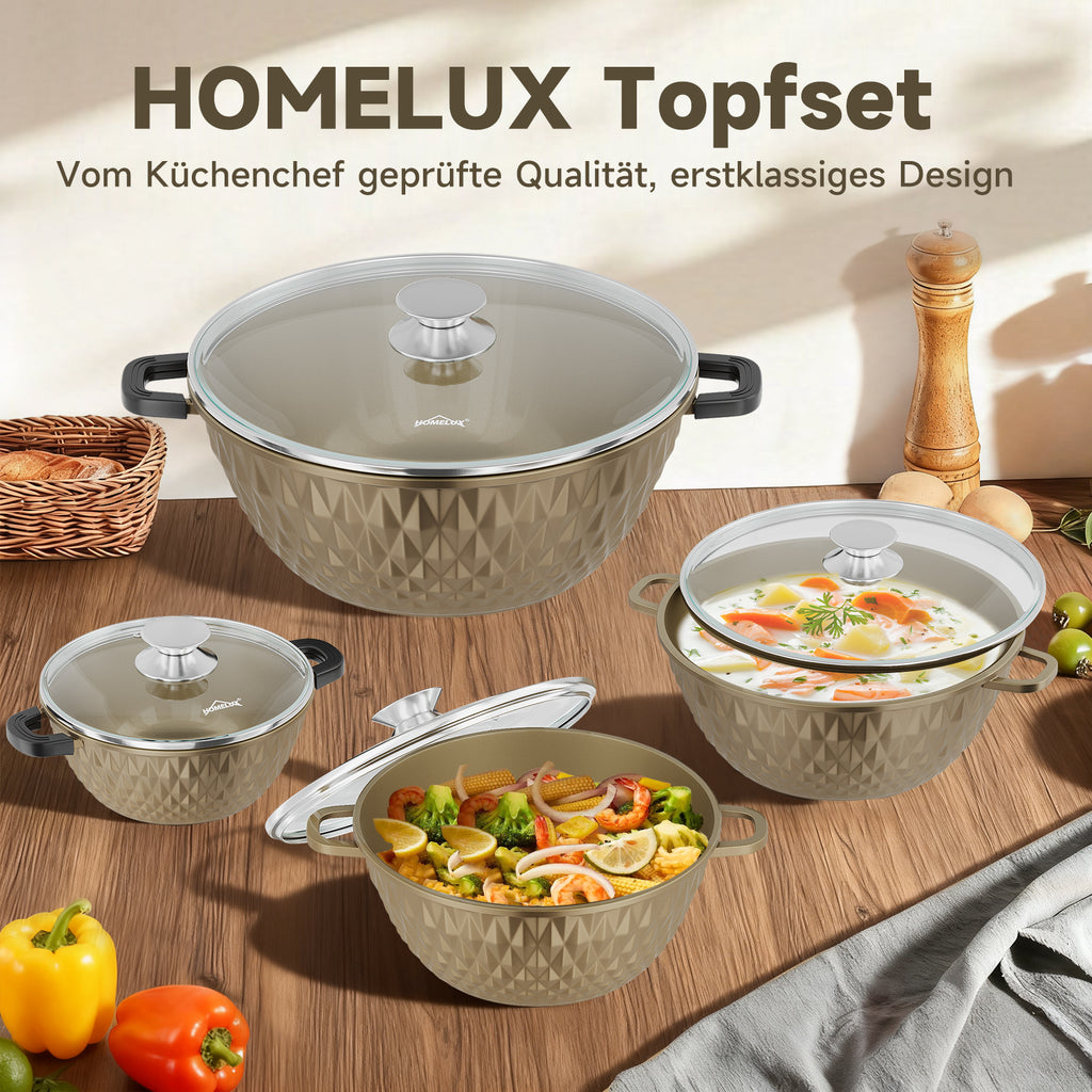 Erleben Sie mit dem HOMELUX Kochgeschirr-Set eine neue Dimension des Kochens. Dieses 8-teilige Set vereint professionelle Funktionalität mit einem ästhetischen, modernen Design. Die Töpfe zeichnen sich durch ihre einzigartige Rautenstruktur an der Außenseite aus, die in jeder Küche einen eleganten Akzent setzt. Gefertigt aus einer hochwertigen Aluminiumlegierung, bieten diese Töpfe eine exzellente Wärmeverteilung und Langlebigkeit, die sowohl für Hobbyköche als auch für anspruchsvolle Küchenchefs geeignet ist. Dank der robusten Bauweise und der vielseitigen Einsatzmöglichkeiten ist dieses Set der ideale Begleiter für die Zubereitung von Suppen, Eintöpfen, Fleischgerichten und vielem mehr.