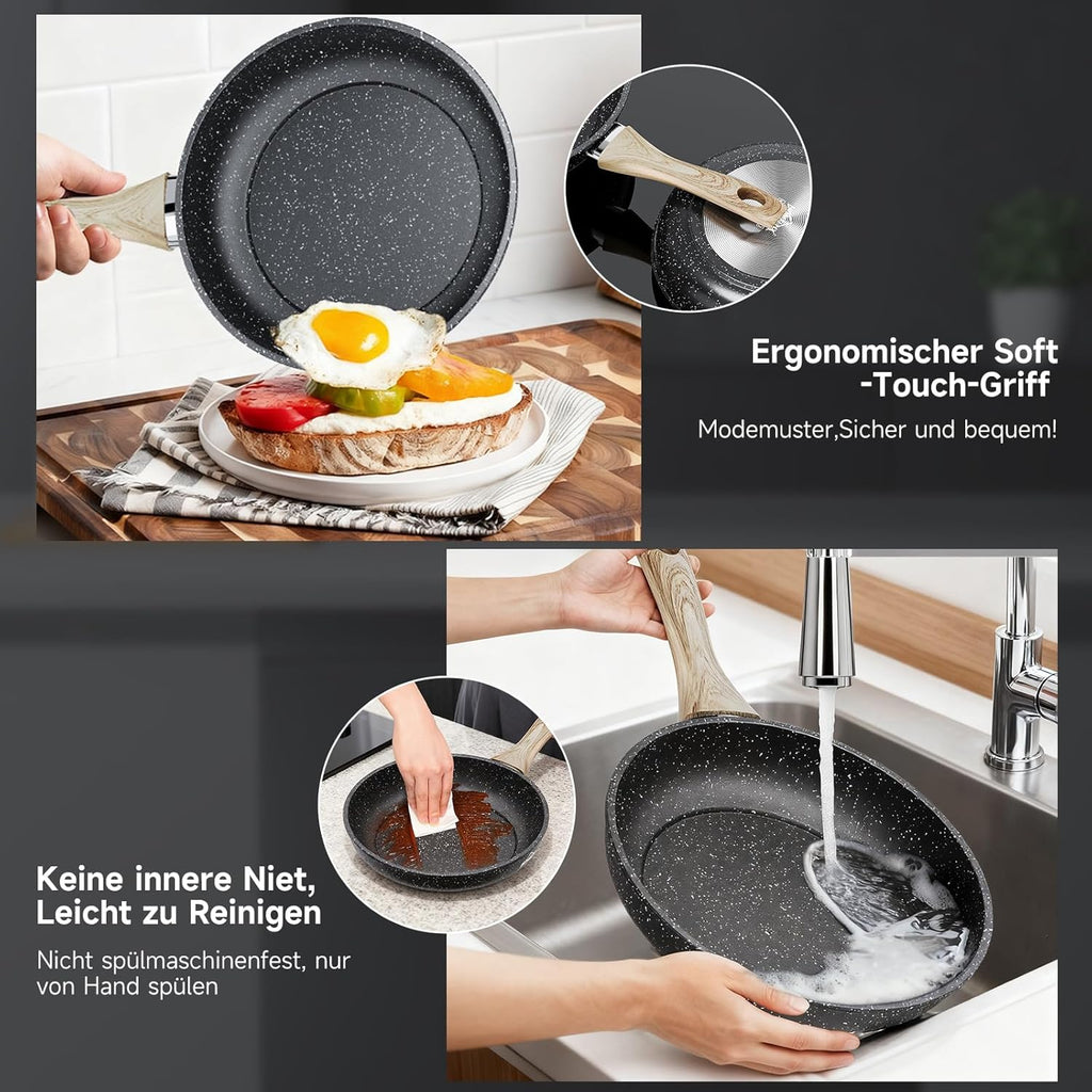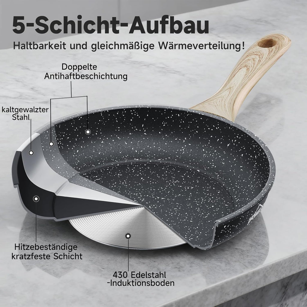 Doppelschichtige Antihaft-Pfanne für gesünderes Kochen mit weniger Öl, frei von PFOA, PTFE und anderen schädlichen Chemikalien.