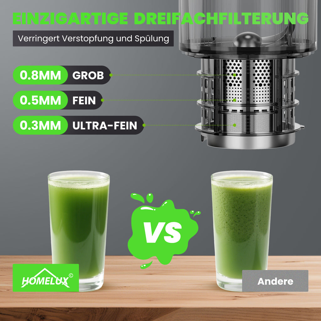 • Dreifache Filterung (0,8 mm / 0,5 mm / 0,3 mm) für besonders reinen Saft