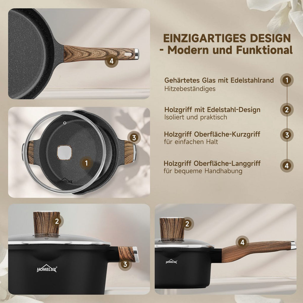 Stil trifft Funktion – Ergonomische Bakelit-Griffe, hitzebeständige Glasdeckel, elegante Holzmaserung, sicher, komfortabel und stilvoll beim Kochen.