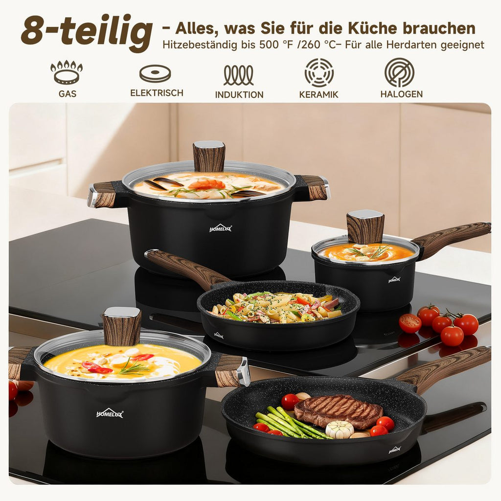 Vielseitiges 8-teiliges Topfset – Pfanne 24/28 cm, Milchtopf 16 cm, Kochtopf 24/28 cm, ideal für Kochen, Braten und Schmoren im Alltag.
